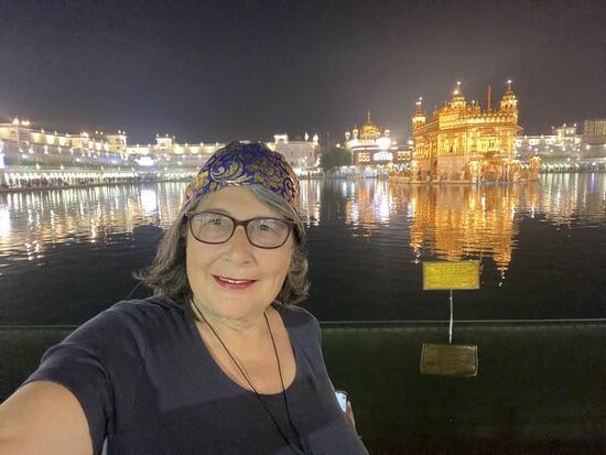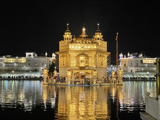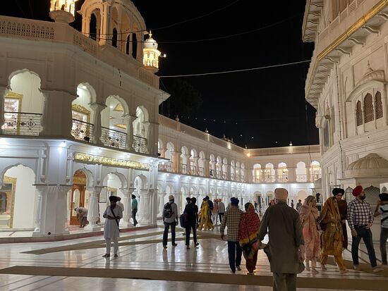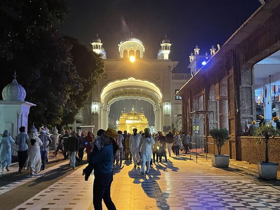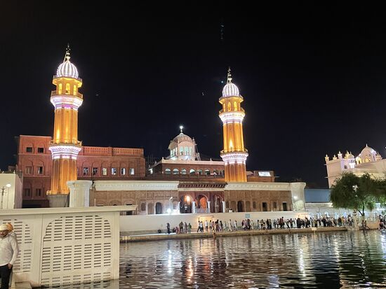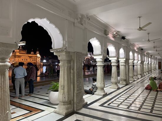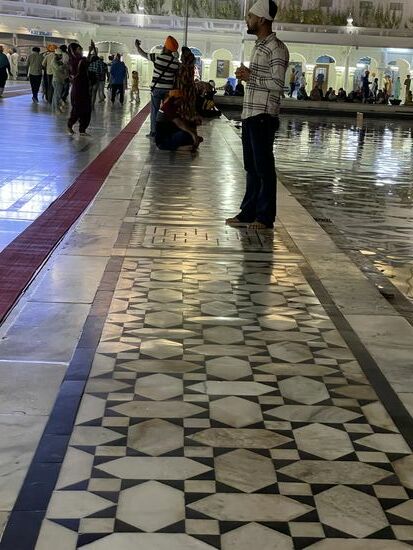 Es ist ein riesiger Unterschied, etwas auf einem Fotos zu sehen, oder jetzt tatsächlich davor zu stehen. Mir verschlägt es fast den Atem. Mitten in diesem grossen Wasserbecken steht golden und von vielen Scheinwerfern angestrahlt, der goldene Tempel. Fast würde ich auch auf die Knie fallen vor so viel Schönheit, so viel Heiligkeit. So wie es ganz viele Menschen um mich herum machen. Sie haben zum Teil bereits beim Tor kurz den Boden mit den Händen berührt. Jetzt verneigen sie sich tief, knien am Boden, den Kopf tief geneigt, So verharren sie einen Moment, dann richten sie sich wieder auf. Verrichten noch ein kurzes Gebet und gehen dann wie ich auf den kühlen Steinplatten oder benutzen die Teppichbahnen, die überall ausliegen, denn ich glaube, tagsüber werden die Platten heiss werden.