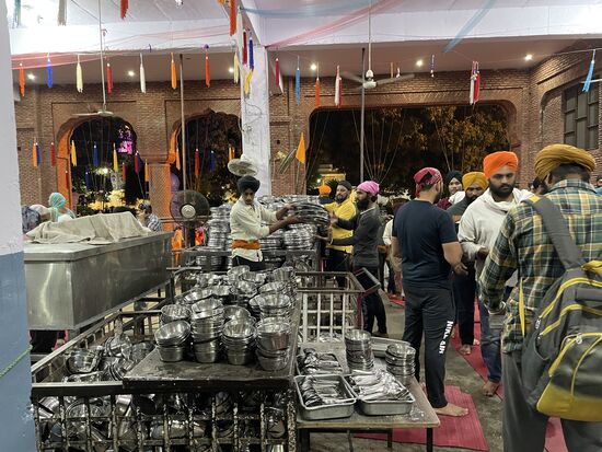 Als ich nach meinem langen und bedachtigen Umgang nach mehr als einer Stunde wieder zum Tor heraus trete, fällt mir der unglaubliche Lärm auf, der aus dem grossen Haus dringt, das mit den beiden Türrmen wie eine Moschee aussieht. Es ist ein metallisches Geräusch, als ob jemand auf Blech schlagen würde. Neugierig trete ich ein und bekomme gleich einen Blechteller in die Hand gedrückt. Respektive fast, denn ich nehme ihn nicht entgegen. Sehe aber bei den anderen Besucher, dass als nächstes ein Blechbecher und ein Löffel hingestreckt werden. Es sieht ganz danach aus, dass hier Essen verteilt wird. Der Lärm kommt von dem Verteilen und Benutzen des Blechgeschirrs im ganzen Haus.