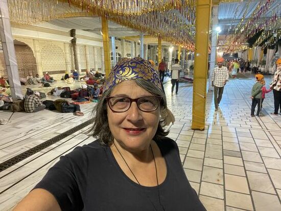 Also brige ich die Schuhe zum Schalter, bekomme eine Nummer und suche mir aus dem Behälter mit den Kopftüchern etwas aus. Da ich mich etwas unbeholfen anstelle, hilft mir ein Mann, den Knoten im Nacken zu machen und dann gehe ich durch das Tor. Wate durch die Wasserschranke, bei der die Füsse gewaschen werden und stehe baff auf der Treppe, Blick auf den goldenen Tempel.