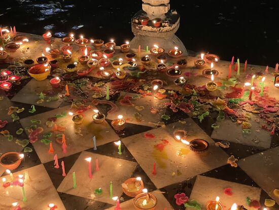 Überhaupt die Knaller. Schon am frühen Abend ist es losgegangen. Es knallt im Sekundentakt. Überall in den Gassen und zwischen den Verkaufsständen verkaufen fliegende Händler Raketen und Knallkörper. Und überall werden sie losgelassen. Überall, ausser hier im Tempelbereich. Hier bleibt die andächtige Stimmung. Was aber niemanden davon abhalt, Selfies und Gruppenfotos zu machen. Alle die hier sind, wollen ihren Freunden zeigen, was sie machen wo sie sind. Mir geht es da nicht anders.