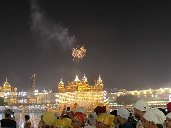 Und hinter dem goldenen Tempel geht ein Feuerwerk ab. Immer wieder steigen farbige Raketen hoch in den Himmel und zerplatzen in tausende von Sternen.