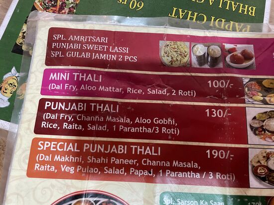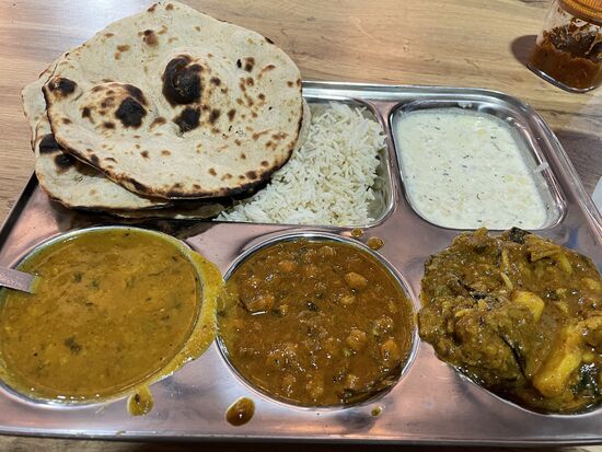 Heute bestelle ich ein richtig typisches Menu und werde nicht enttäsucht. Punjabi Thali besteht aus Dal, KIchererbsen und einem Gemüsecurry, zusammen mit Reis, einer Yoghurtsosse und Roti.