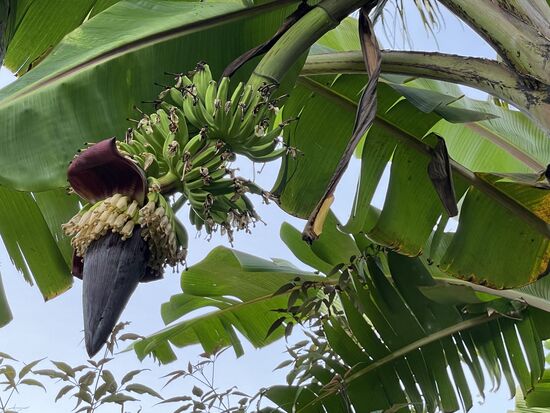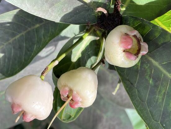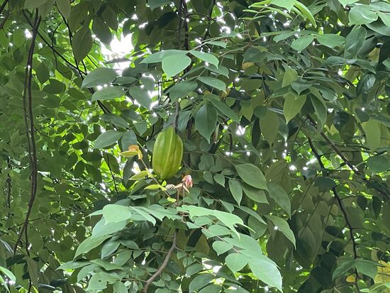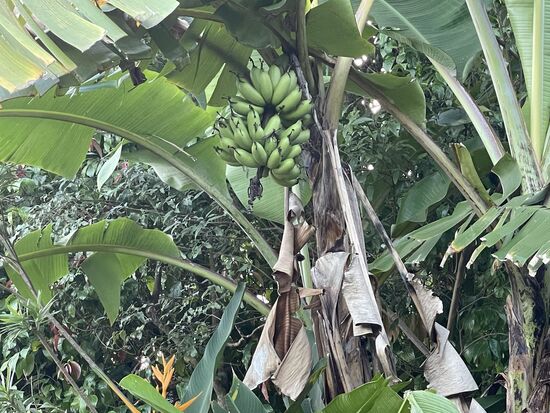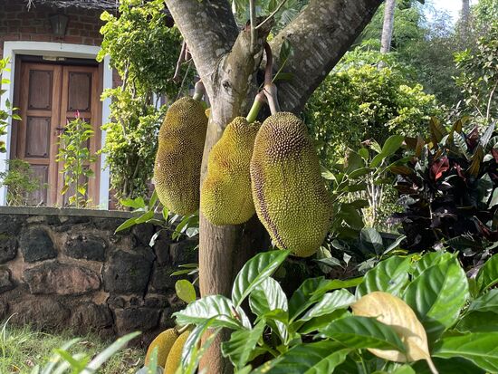 Manchmal streife ich durch den Garten auf der Suche nach Fotomotiven. Dabei sind mir die vielen Früchte aufgefallen, die hier wachsen. Angefangen bei den allgegenwärtigen Kokospalmen, die zum Teil mit einem Netz die allenfalls herabfallenden Kokosnüsse auffangen, zu den Bananen, die wunderschöne Blüten mit Früchten tragen, gibt es Mangos. Ihre Früchte sind etwas rar und versteckt. Es gibt aber auch Java-Äpfel, die ich aus Peru vor allem wegen ihrer wunderschönen Blüten kenne. Beim Eingang habe ich einen Baum mit Karambole/Sternfrucht entdeckt. Die Früchte sind noch hellgrün und zwischen den grünen Blättern gut versteckt. Ganz auffallend sind die riesigen Jackfrüchte. Diese Früchte hängen direkt am Stamm und sind sehr schwer. Einmal gab es sie auf dem Buffet