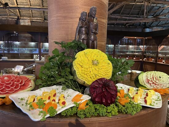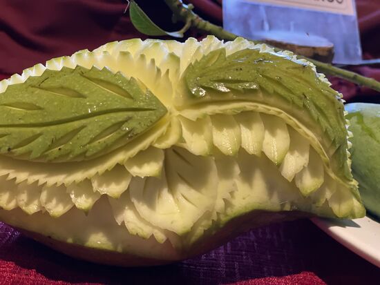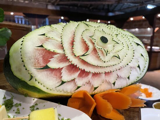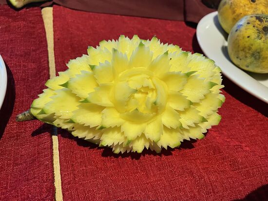 Für diesen speziellen Abend hat der Koch wunderschöne Dekorationen gemacht. Einen grossen Kürbis und zwei Wassermelonen hat er zu aufwändigen Blumen verziert. Und auch die Mangos sind mit ihren Schnitzereien kaum mehr zu erkennen.