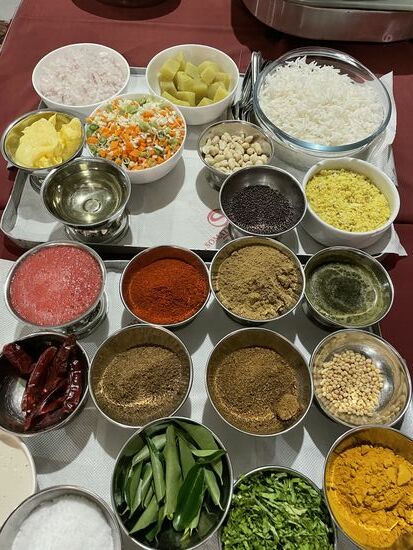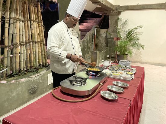 Am Donnerstag-Abend gibt der Koch immer eine Koch-Vorführung. Er hat dazu ein umfassendes Mise-en-place aufgebaut und erklärt alle Zutaten ganz genau. Dann kocht er in einer kleinen Pfanne drei Gerichte und wir sind alle erstaunt, wie schnell das geht. Die Vorbereitungen werden wohl länger gedauert haben, denn alles ist bereits gerüstet und gehackt. Und die Thoran-Mischung bleibt uns verborgen auch wenn er die Ingredienzen genau erklärt. Auch die Dal-Mischung aus gekochten und pürierten Linsen scheint etwas aufwändig zu sein.