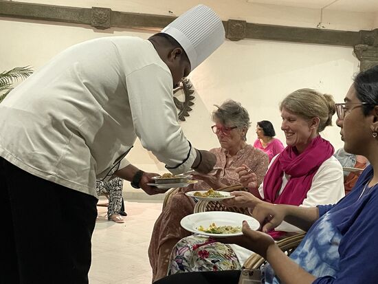 Überhaupt die Desserts. Zu jedem Mittag- und Nachtessen gibt es einen Nachtisch. Die schmecken so wunderbar, so süss und sündig, dass ich froh bin, mich nicht für eine Abnehmkur entschieden zu haben. Denn dann käme ich nicht in den Genuss aller Köstlichkeiten, die täglich auf dem Buffet in den grossen Schüsseln angerichtet werden. Tatsächlich vermisse ich bis heute weder Fleisch noch Fisch oder sonst irgendetwas aus meinem normalen Essen. Auch den Tee, der einem bei Tisch immer nachgeschenkt wird, habe ich schätzen gelernt. Mit Rudi und Ernestine stossen wir gelegentlich an. "Noch ein Achtel Rosé!" bestellen wir dann bei Ramesh, dem Kellner.