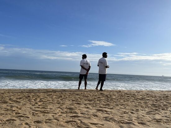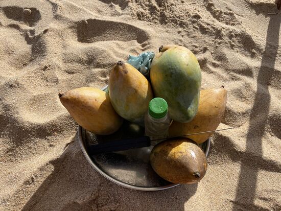 Das Resort hat hier einen kleinen Strandabschnitt wo die ganze Zeit zwei Life-Guards auf die Gäste warten und ihnen einen Liegestuhl mit Badetuch zur Verfügung stellen. Auch einen Sonnenschirm stellen sie auf. Sie sind unglaublich hilfsbereit, lassen mich den Stuhl keinen Zentimeter selber verschieben. Da nur wenige Gäste herkommen, bemühen sie sich, den wenigen, die kommen, den Aufenthalt so bequem wie möglich zu machen. Manchmal kommt ein Verkäufer vorbei, will Schals verkaufen, oder Tischtücher. Ich muss jedesmal abwinken, ja ich bin soweit, dass ich sie gar nicht mehr beachte. Werde wohl kein gutes Karma einholen hier., denn als ich sehe, wie sich die Frau mit den Früchten freut, als ihr eine Kokosnuss abkaufe, merke ich, dass sie heute noch gar nichts verkauft hat. Dass ich dafür 100 Rupien bezahlt habe, ist vielleicht zu viel, aber es war ihr erstes Geld heute. Um 17.00 Uhr. Genausowie die Kartenverkauferin mit ihren selbstgemalten Bildern auf Blättern.