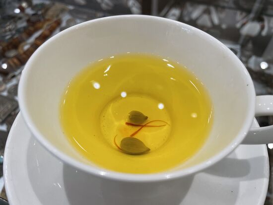 Einmal war ich bei Rafeeq, der bei der Rezeption seinen Souvenirladen betreibt. Vor allem Handarbeiten aus Kaschmir hat er im Angebot. Weil die Arbeiten aus Kaschmir einfach die schönsten sind, wie er mir versichert. Obwohl ich ihm erkläre, dass ich nichts kaufen werde, da ich noch lange unterwegs bin, offeriert er mir eine Tasse Tee. Allerdings korrigiert er sofort. Ein richtiger Tee ist das nicht. Aber es ist das traditionelle Getränk in Kaschmir. Er gibt einen Zimtstängel in seinen Wasserkocher, zerdrückt ein paar Kardamomsamen und gibt sie dazu. Das kocht er mit etwas Honig auf und legt am Schluss noch zwei-drei Safranfäden dazu. Das Getränk schmeckt leicht und duftet himmlisch.