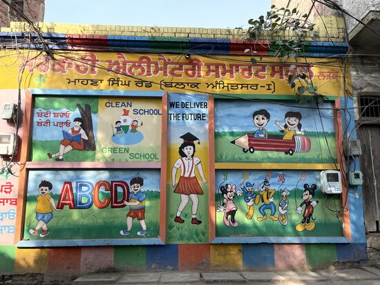 Da, die farbigen Bilder weisen auf eine Schule hin. Und tatsächlich steht da über dem Torbogen ein Hinweis auf eine "local School". Immer wieder fallen mir die zwei Schriften auf. Die Kinder müssen nicht nur unser Alphabet lernen, nein ihre erste Schrift ist die Hindi-Schirft, die mir extrem kompliziert vorkommt. Erst danach lernen sie auch Englisch und mit ihm unsere Schrift. Eine echte Herausforderung.