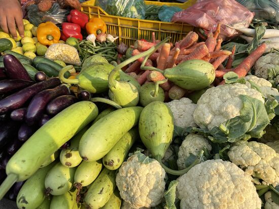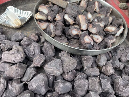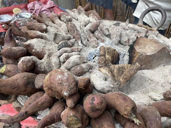 Er verkauft Knollengemüse. von den kleinen schwarzen Dingern gibt er mir eines zu versuchen. Es scheinen kleine Kartoffeln mit schwarzer Schale zu sein. Jedenfalls schmecken sie so.