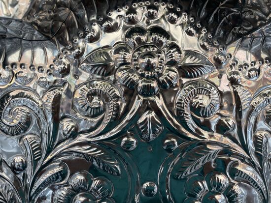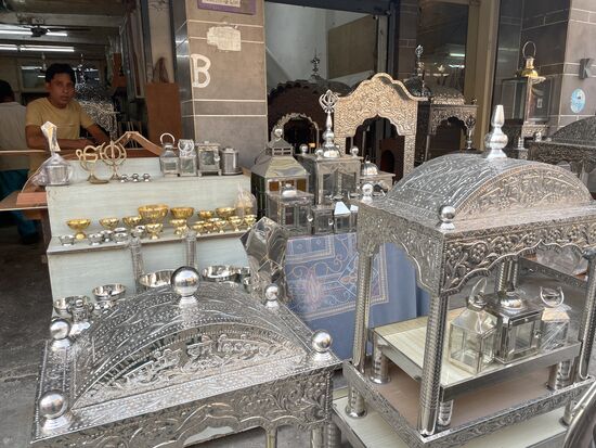 Bei den Metallarbeitern bleibe ich etwas länger stehen. Ich würde gerne sehen, wie sie die aufwändigen Muster in das Blech schlagen. Von Hand, bestätigen sie mir alle, aber es ist grad keiner an der Arbeit. Ob sie dafür Schablonen haben? Ich weiss es nicht.