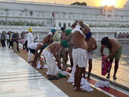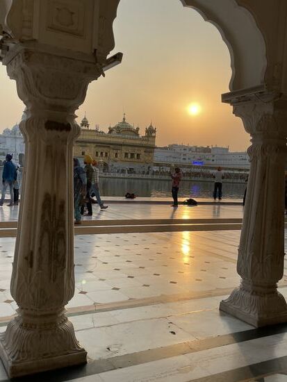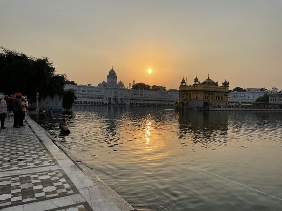 Es ist später Nachmittag, die Sonne sinkt hinter den Häusern, lässt den Tempel in ihren Strahlen noch einmal besonders glänzend erscheinen, ich gehe langsam zum Eingang. Doch hier ist die Schlange der Anstehenden noch immer sehr lang. Ich rechne mit mehr als einer Stunde und verzichte darauf. Dann war ich eben nicht drinnen, im goldenen Wahrzeichen. Überlasse ich das Heiligtum den Sikhs, ich finds ja schon toll, dass ich mich hier im Hof ungezwungen bewegen kann.