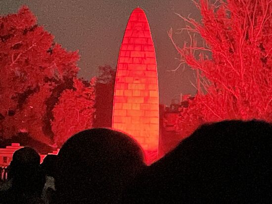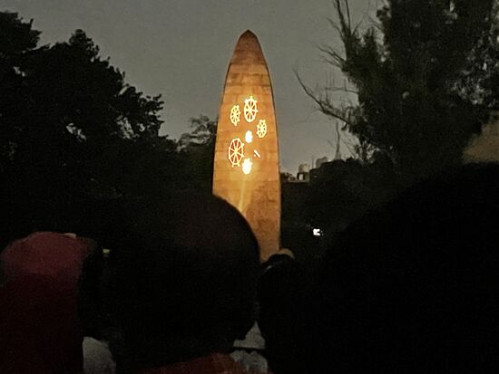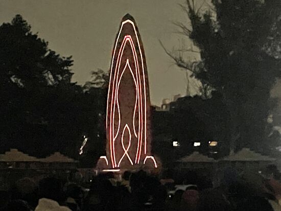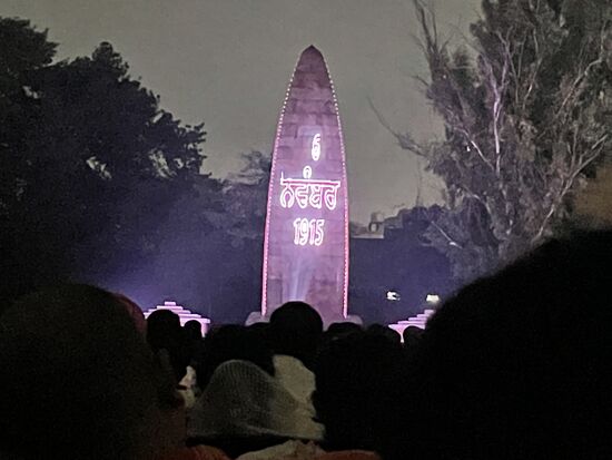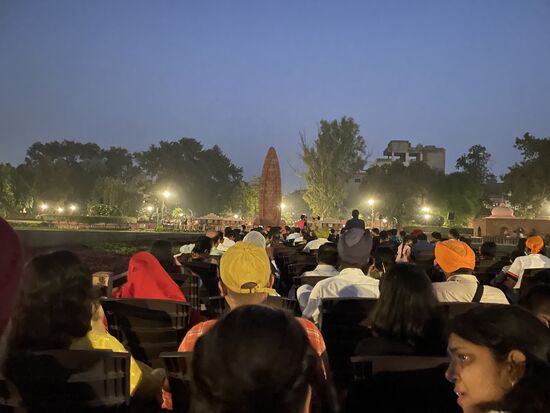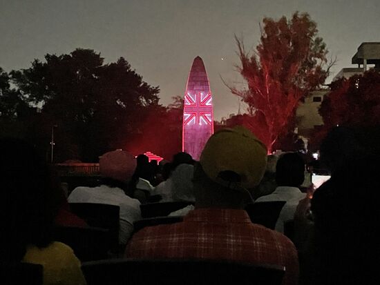 Nachdem es dunkel geworden ist, fängt die Lichtshow an. Zu stimmungsvoller Musik ertönen Stimmen, ein Erzähler, verschiedene Menschen, die sich an die Ereignisse erinnert haben. Ich verstehe allerdings kein Wort und das ist vielleicht auch gut so. Jedenfalls wird die britische Fahne gezeigt, das Datum, verschiedene Zeichen der Sikhs und am Schluss erstrahlt das Denkmal blutrot.