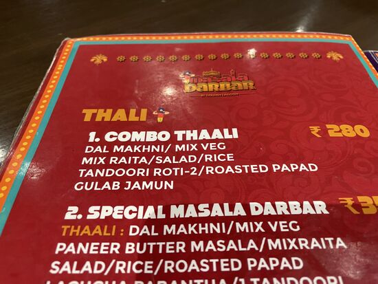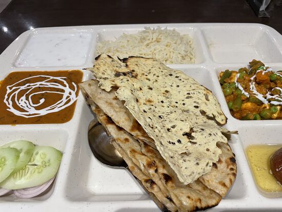 Das Essen schmeckt wunderbar. Eine gemischte Platte mit Reis, Dal, Gemüse-Masala, Yoghurt, Gurkensalat und Roti. Sogar eine süsse Dessertkugel, eingelegt in Honig ist dabei.