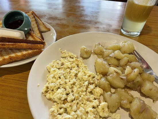 Bratkartoffeln - wann hatte ich sowas zum letzten Mal? - Rührei und Toast mit Butter bekomme ich und einen Tee mit Milch.
