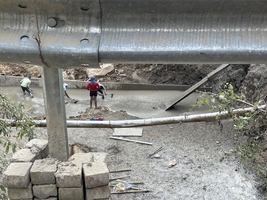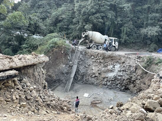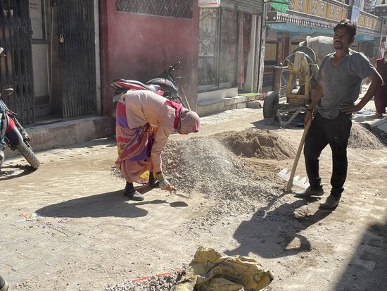Frisch gestärkt steige ich weiter hinauf, gehe durch das Dorf und komme zu der Baustelle, die wohl der Grund ist, dass die Strasse zum Teil wechselseitig einspurig geführt wird. Wie an allen Baustellen im Land fällt mir auch hier wieder eine Frau auf, die hier in ihren langen Kleidern arbeitet. Was sie allerdings mit ihrem kleinen Spachtel auf der Strasse anstellen will, kann ich nicht ganz erkennen, aber ich sehe, dass trotz Betonmischer auch hier fast alles in Handarbeit erledigt wird.