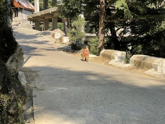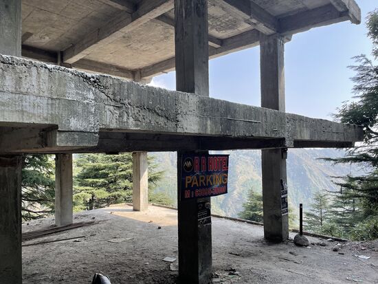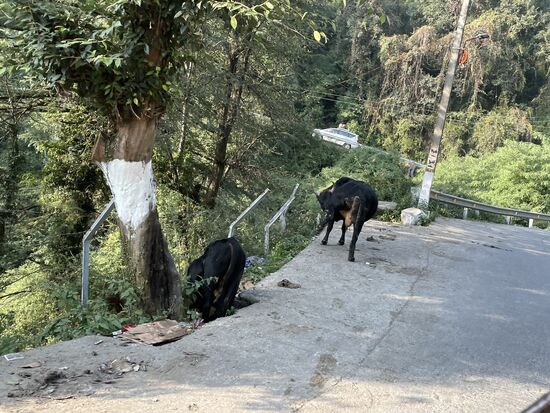 Ich gehe weiter den Hang hinauf, immer weiter die steile Hauptstrasse entlang. Ich habe inzwischen den Ort verlassen, komme in einen Bergwald. Da oben gibt es noch ein paar Hotels. Ob sie ganz neu, oder bereits am Verlottern sind, ist mir nicht immer ganz klar, jedenfalls wurden sie ziemlich abenteuerlich zwischen die hohen Tannen gebaut. Ob da wohl alle Hangsicherungen berücksichtigt wurden?