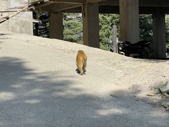 Bei einem Parkhaus-Neubau - jedenfalls hängt da ein Schild PARKING - vielleicht wird es später doch ein Hotel, denn es hat eine wunderbare Aussicht - begegnen mir ein paar Affen. Ich bleibe stehen, überlege schon, ob ich umkehren soll. Ich merke, die Begegnung mit dem Affen in Bali, der mir die Brille aus dem Gesicht gerissen hat, hat einen tiefen Eindruck hinterlassen. Natürlich würde ich sie gern fotografieren, getraue mich aber erst, als sie schon etwas weiter weg sind und mir den Rücken zukehren, was natürlich nicht sehr attraktive Bilder gibt.