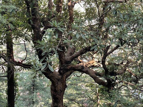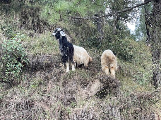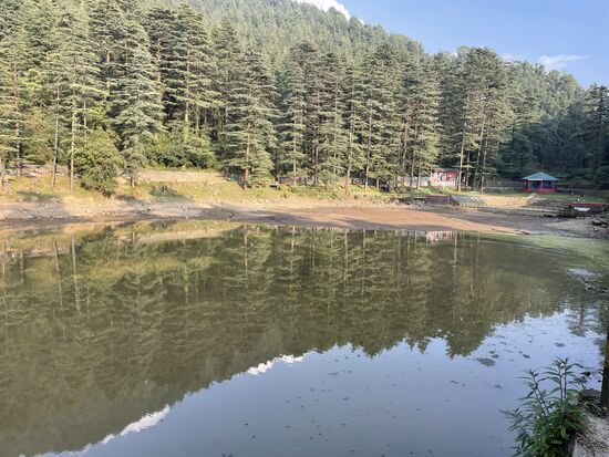 Wir fahren weiter auf der schnalen Bergstrasse, begegnen irgendwo, weit weg von den Häusern, ein paar Kühen, die auch hier anscheinend frei leben und kommen zu einem kleinen See. Der sei jetzt fast ausgetrocknet, meint Rajesh. Zu anderen Jahreszeiten sei er voll und wunderschön. Nun, es hat noch genügend Wasser, dass sich die Bäume am Ufer darin spiegeln können aber man kann am Ufer schon erkennen, dass der Wasserspiegel normalerweise höher ist.