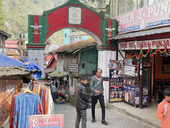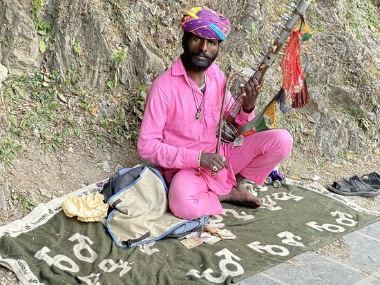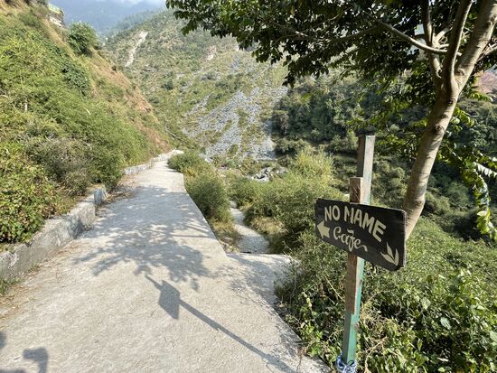 Also folge ich den Verkaufsständen, die es immer dort hat, wo spezielle Touristenattraktionen auf Gäste warten und komme auf einen schmalen Weg. Etwas weiter unten sehe ich den Bach, aber einen Wasserfall kann ich nicht erkennen. Wenn die das Wasser meinen, dass über ein paar höhere Steine in ein etwas tieferes Becken fällt, dann kann ich auf diese Attraktion und den Abstieg und Aufstieg gut verzichten. Ich höre lieber dem Musikanten zu, der für ein paar Rupies die Leute unterhält. Und staune über die fantasievollen Namen der kleinen Beizlein am Weg. Fusion-Cafe, No name Cafe, Welcome-Cafe...