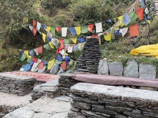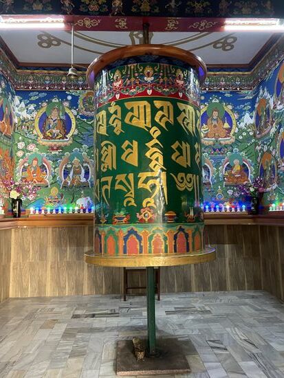 Beim Ausgang begegnet mir noch einmal eine grosse Gebetsmühle in einer Nische, ähnlich wie die, die im Dorftempel steht. Auch sie dreht sich noch lange weiter, nachdem sie einen Anstoss bekommen hat, verbreitet ihre Lehre an alle, die dafür empfänglich sind.