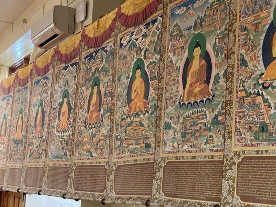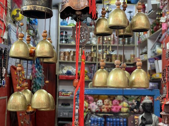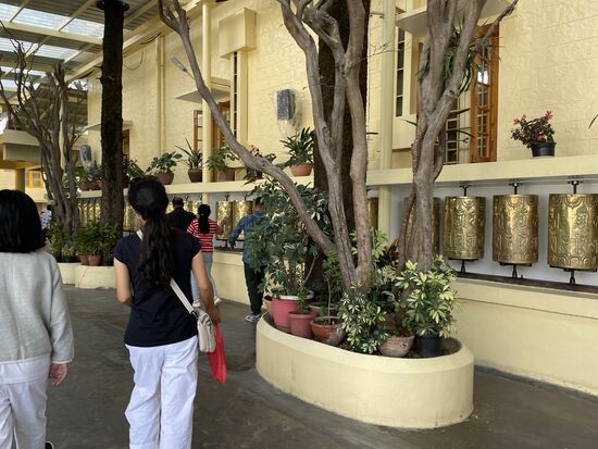 Rund um den Tempel sind goldene Gebetsmühlen angebracht, die die Leute drehen, damit sich die Sprüche und Weisheiten, die darauf geschrieben sind, verbreiten und auf die Umgebung wirken, auf dass sich eine gute Atmosphäre verbreite und der Frieden in die Menschen eingehen soll.