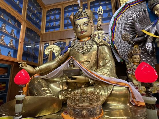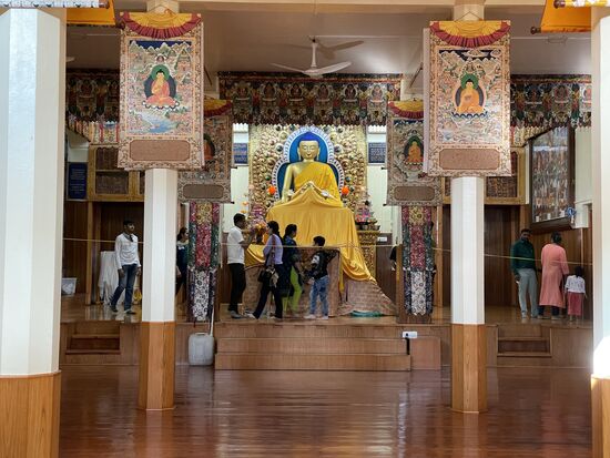 Der Tempel selber ist eigentlich nur eine grosse Halle. An den Seiten sind viele Teppiche aufgehängt, vorne thront eine grosse goldene Buddhastatue und davor ein breiter Stuhl mit einem gelben Tuch überdeckt. Wahrscheinlich sitzt dort der Dalai-Lama, wenn er im Tempel ist.