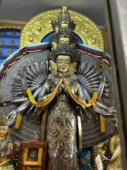 Der Altar ist mit goldenen Schnitzereien verziert. In einer Seitennische sind ein paar grosse Statuen, wobei eine drei Köpfe mit je drei Gesichtern trägt. Ganz oben sitzt noch einmal ein Kopf. Also eine Statue mit 10 Gesichtern, während die Statue daneben eher ein Dämon ist. Mit seinen grossen Augen sieht er jedenfalls ziemlich furchteinflössend aus.
