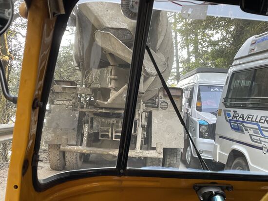 Vor uns lauter Autos, doch auf der linken Spur hat es noch genügend Platz zum überholen. Jedenfalls für einen frechen Tuctuc-Fahrer. Ganz zuvorderst sehen wir die Ursache für den Stau. Ein grosser Betonmischer lässt seine Ladung hinunter in ein Bachbett fliessen. Dieses soll wohl ausgebaut werden, da der Bach im Moment kein Wasser führt. So wie es aussieht, wird es noch weitere Ladungen brauchen und viel Zeit, bis es richtig ausgetrocknet ist.