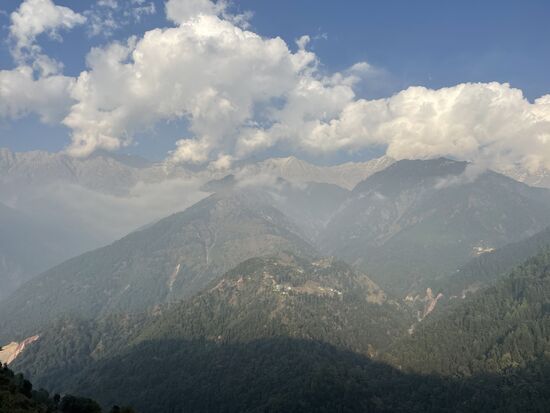 Es geht noch immer in die Höhe, bis mein Höhenmesser 1900 Meter anzeigt. Hier halten wir an, hier gibt es einen Aussichtspunkt, der bestimmt eine wunderbare Aussicht in das Tal bieten würde, wenn es da unten nicht so dunstig wäre. Aber immerhin, der Blick in die Berge ist grandios und wenn ich genau hinsehe, erkenne ich hinter den Wolken das gewaltige Himalayamassiv.