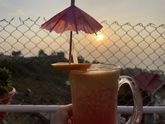 Diese lassen sich allerdings nicht gut fotografisch festhalten, so dass sie bei mich eher wie schlecht belichtete Fotos ankommen. Doch vielleicht fehlt mir in diesem Zusammenhang einfach der esoterische Hintergrund. Jedenfalls kommen wir zur rechten Zeit zurück zum Restaurant, wo ich diesmal allein bleibe. Rajesh wartet im Tuctuc bis ich meinen Moctail Ping Pong mit dem untergehenden Feuerball der Sonne getrunken habe.