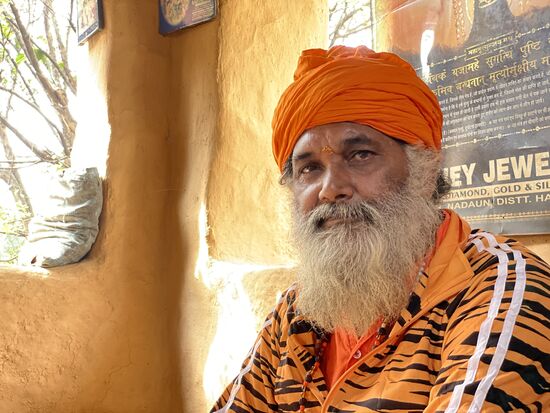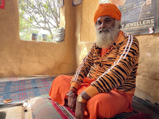 Nachdem ich vom Fluss wieder wieder aufgestieben bin, setze ich mich einen Moment auf eine niedrige Mauer, versuche diese Umgebung mit den roten Gebäuden, den gelben gemauerten Kuppelspitzen in mich aufzunehmen, als mich ein Mann anspricht. Ein Mann in orangen Kleidern mit einem orangen Turban, einer tigergemusterten Fleesjacke, die zwar farblich stimmt, aber kultig nicht so richtig zu ihm passen will. Ein moderner Yogi? Woher ich komme, will er wissen, und dann lädt er mich zu ihm in seinen kleinen Raum ein.