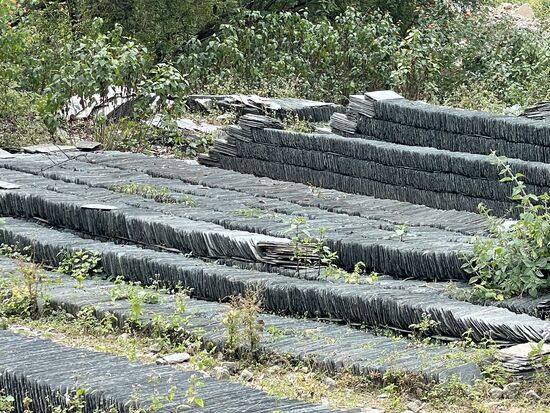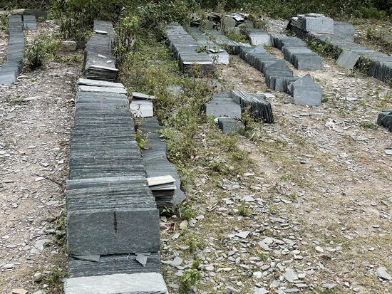 Beim Weiterfahren kommen wir an diesem Lagerort vorbei, wo ganz viele Schiefertafeln liegen. Hab ichs doch gewusst, als ich gestern den Stein beim Bachbett gesehen hatte. Hier wird Schiefer abgebaut. Gebraucht wird er zum Decken der Dächer. oder als Bodenplatten. Auch in meinem Hotel gibt es eine dekorative Mauer aus Schiefertafeln.