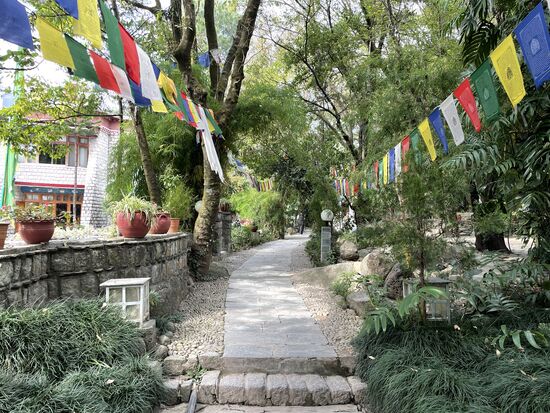 Die ganze Anlage ist in einem grossen Garten. Die Gebäude sind im typischen tibetischen leichten Baustil mit dünnen Wänden und Schiebefenstern gebaut und ich frage mich, wie man wohl im Winter hier lebt, denn eine richtige Heizung kann ich nicht erkennen und isoliert scheinen mir weder Fenster noch Türen zu sein. Kalt wird es im Winter bestimmt, denn wir sind hier auf über 1500 m. Überall im Garten wehen die farbigen Gebetsfahnen. Sie zerfleddern im Wind und in der Natur und sollen die aufgedruckten Gebete und Mantras in die Welt verteilen.