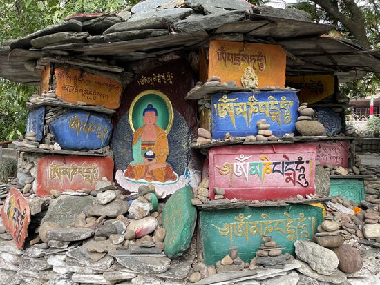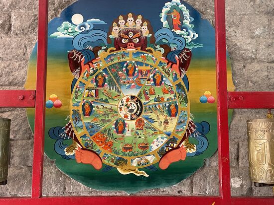 Natürlich gibt es auch hier eine Wand mit Gebetsmühlen, die von jedem Gläubigen angestossen werden. Auch hier das gleiche Prinzip. Durch die Bewegung werden die Mantras und guten Wünche, die auf den Gebetsmühlen geprägt sind, in die Umgebung abgegen. Genauso wie das mit den Gebetsfahnen passiert.