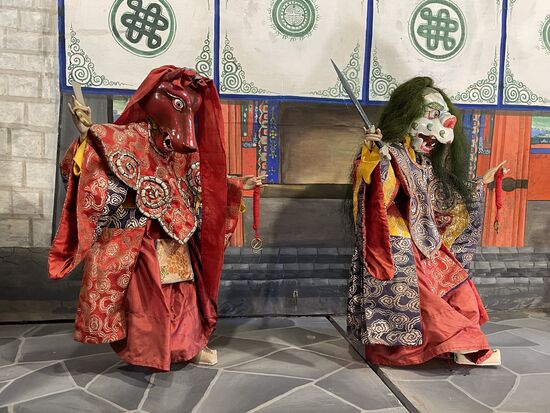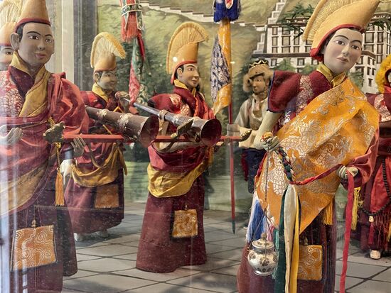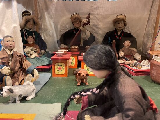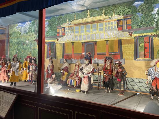 In einem Nebengebäude gibt es ein Puppenmuseum. Hier sind hunderte von Puppen ausgestellt. Aufwändig bekleidet in traditionellen Gewändern. Es werden Prozessionen dargestellt, Tänze, Beerdigungen, Geisterbeschwörungen, Familienleben, Feste. Das ganze tibetische Leben, das in Llasa, der Hauptstadt Tibets nicht mehr möglich ist, seit China den Staat übernommen hat.