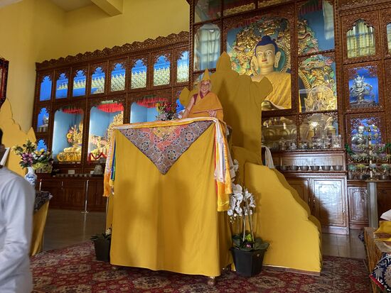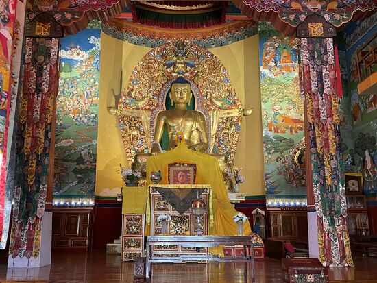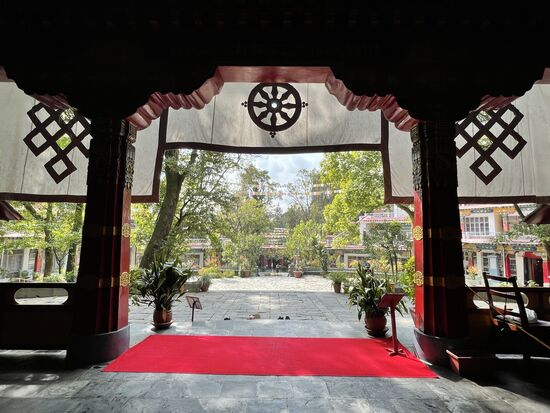 Es ist eine ruhige Anlage mit schönen Pflanzen, bequemen Gehwegen die leicht ansteigen und mit breiten Treppen unterbrochen werden. Sie führen hinauf zum Tempel. Hier im Tempel sitzt ein grosser Buddha und auch hier steht davor ein Thron mit einem gelben Tuch. Um zu zeigen, wofür der Thron ist, steht darauf ein grosses Portrait des Dalai-Lama.