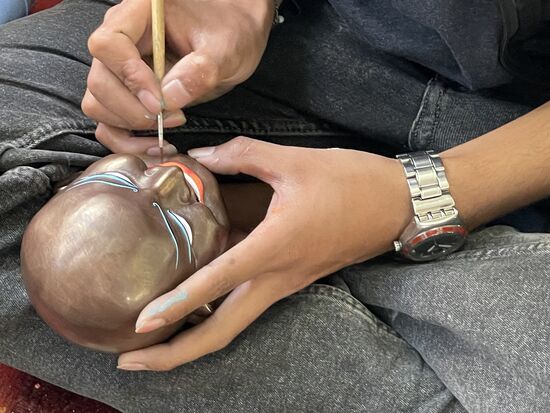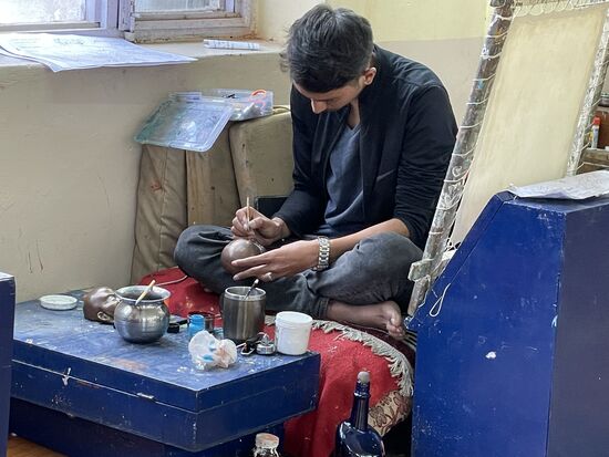 Die Künstler sind hochkonzentriert, lassen sich von den Besuchern, die um sie herum stehen und genau hinsehen, keinen Moment stören. Hier arbeiten ausschliesslich junge Männer, angeleitet von einem etwas älteren Meister. Ich muss etwa schmunzeln. Auch wenn das ganze eine alte Tradition ist, einige von den jungen Künstler haben ihr Handy neben sich gelegt. Darauf ist ihre Vorlage.