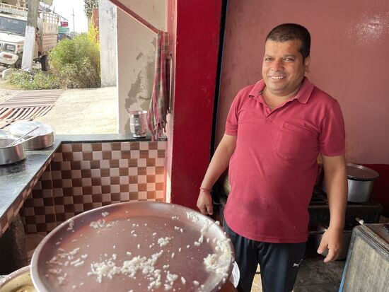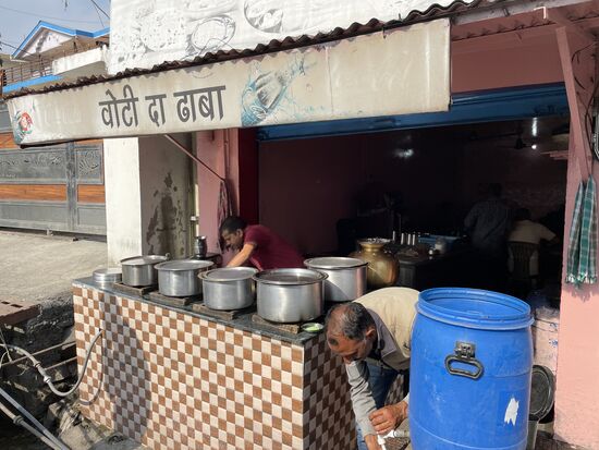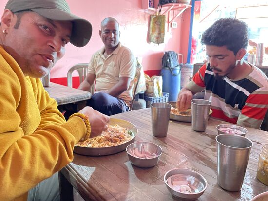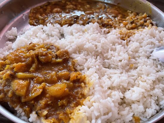 Es ist eine kleine Küche am Strassenrand mit ein paar Tischen, mit einem Menu. Es gibt Reis, Dal und ein Gemüsecurry. Allein würde ich mich nie getrauen, hier zu essen, aber in Begleitung von Rajesh überwinde ich meine Skrupel, lasse mir eine kleinere Portion geben, die dann allerdings trotzdem gross ausfällt. Aber einen Löffel brauche ich. Die Teller sind gross und aus Aluminium, geschöpft wird aus der Panne und später kommt der Wirt mit Nachschub. Wobei er den Reis mit den Händen herausschöpft. Alle haben sich vor dem Essen die Hände am Wasserfass gründlich mit Seife gewaschen, denn gegessen wird ausschliesslich von Hand. Ich bin die einzige, die einen Löffel benutzt.