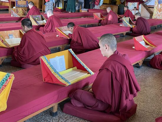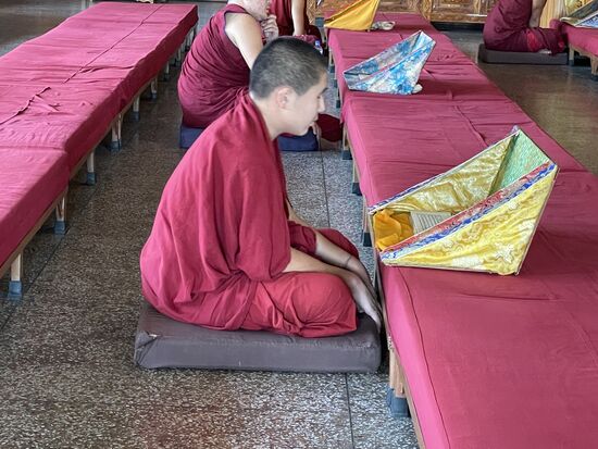 An den Tischen sitzen die Studenten im Lotussitz auf einem Sitzpolster und meditieren. Es sind alles Männer, rot gekleidet, meist junge Männer und Jugendliche. Sie sitzen in gebeugter Haltung, vor sich ein Text, den sie lesen, den sie sich vorlesen und dazu wippen sie mit dem Oberkörper. Der ganze Tempelraum voller Studenten, voller Raunen, Reden, in Bewegung und trotzdem ruhig. Eine eigenartige Stimmung.