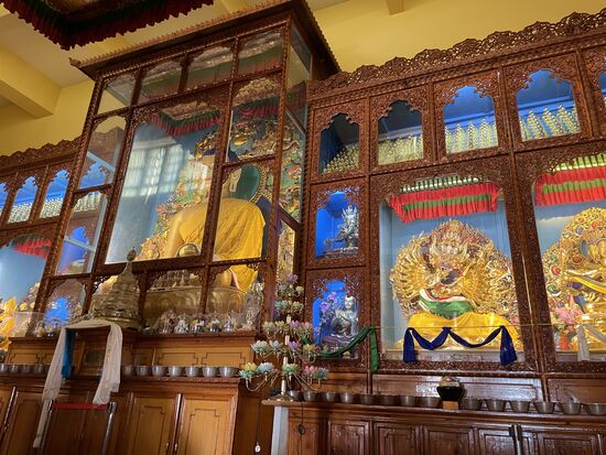 Auch der Altar ist aufwändig geschmückt mit Ornamenten, riesigen Bildern, vielen bunten Bordüren, viel Gold. Es ist eine ganz andere Farbigkeit als in einem Hindu-Tempel, denn hier handelt es sich um eine andere Religion. Es ist der tibetische Buddhismus, dessen Oberhaupt seit 80 Jahren der Dalai-Lama ist. Dieser Tempel ist bedeutend aufwändiger und oppulenter geschmückt, als der Tempel im Dalai-Lama-Tempel oben in Mcleod Ganj.