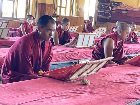 Es ist ein grosses Gelände mit vielen Wohnhäusern. Wahrscheinlich gibt es auch viele Schulräume, die ich allerdings nicht erkennen kann. Die Schüler sitzen im Moment im Tempel. Es sind lange niedrige Tischreihen aufgebaut. Bezogen mit dem Bordeau-roten Stoff, den man hier überall von den Mönchskleidern kennt.