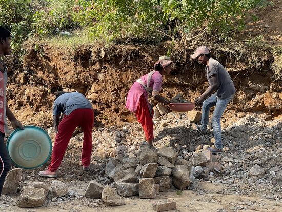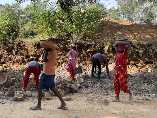 Bevor ich den Ort wieder verlasse, sehe ich ausserhalb der Umzäunung noch einen Moment zu, wie eine Strasse saniert wird. Wieder einmal sind es ausschliesslich Frauen, die die schweren Lasten tragen. Stein für Stein wird das Gelände abgetragen. Die Männer holen die Steine mit dem Pickel aus der Erde und laden sie in die Kübel, dann helfen sie den Frauen, diese auf ihren Kopf zu laden. Es scheint hier völlig normal zu sein, dass die Frauen die schwerste Arbeit ausführen.