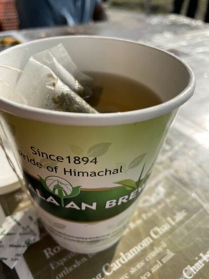Und bin ernüchtert. Ich bekomme natürlich keine schöne Tasse Tee, sondern nur etwas heisses Wasser mit einem profanen Beutel. Es ist wahrscheinlich nicht der Plantagenbesitzer, der hier den Imbiss betreibt, sondern irgendjemand, der sich nicht um die Bedeutung des Tees kümmert. Immerhin sind die Tischsets und Becher entsprechend beschriftet.