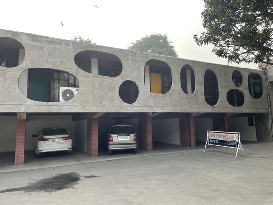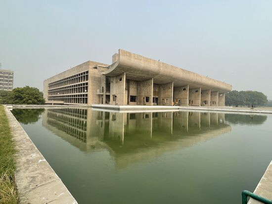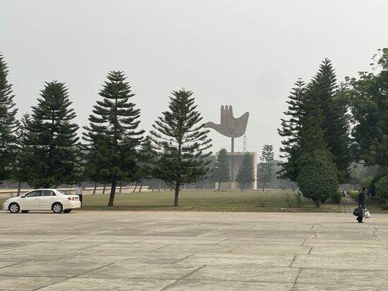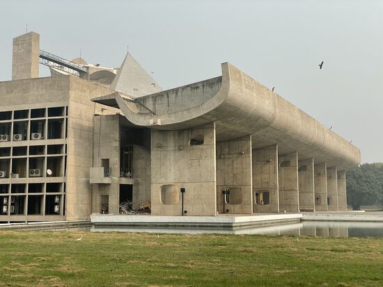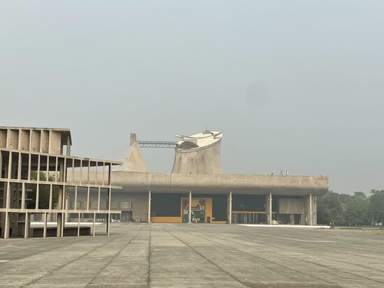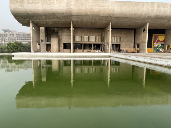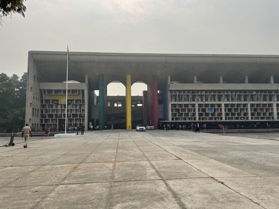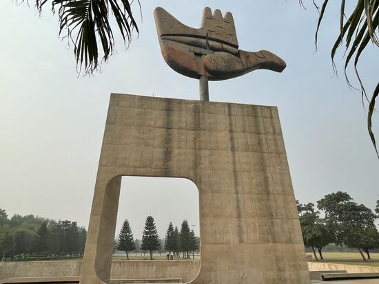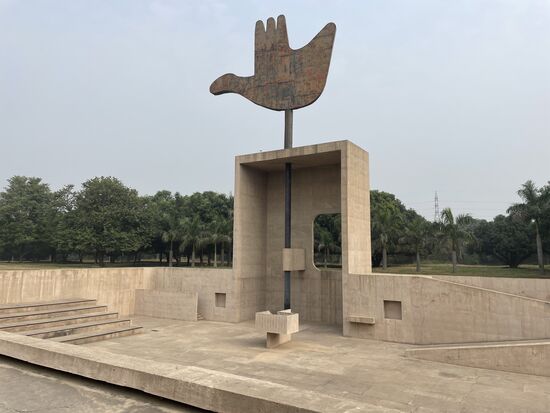 Doch jetzt zum Parlamentsgebäude, das tatsächlich ein Unikum ist. Chandigarh ist nämlich Haupstadt von zwei Bundesländern: Punjab und Haryana. Darum gibt es in dem Gebäude zwei Parlamentssäle die mit den beiden Türmen symbolisiert werden.