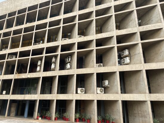 Der Guide erklärt die geniale Architektur. Das grosse Dach mit den Bogen darunter sammelt das Regenwasser, das sich in ein grosses Becken vor dem Gebäude ergiesst und dadurch die Fassade kühlt. Auch die etwas zurückgesetzte Fassade mit den relativ kleinen Fenster hinter dicken Mauern sorgt dafür, dass die Büros schattig bleiben. Heute sind sie allerdings alle mit Klimageräten ausgestattet, das habe ich gestern gesehn, als ich die Rückseite des Hauses gesehen habe.