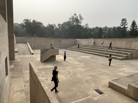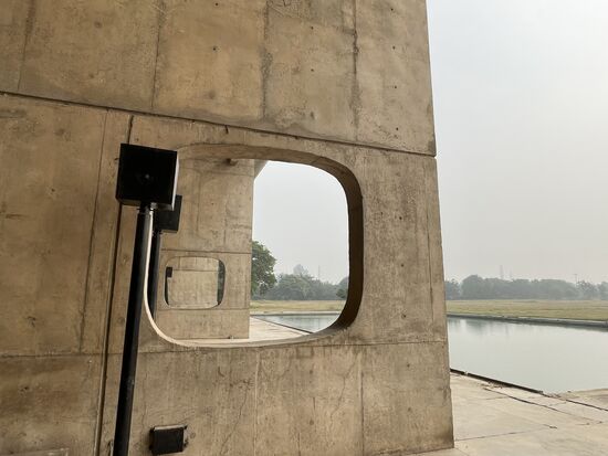 Bevor wir uns dem auffälligen Parlamentsgeäbude zuwenden, macht uns unser Guide noch auf den Schattenturm aufmerksam. Le Corbusier hat viel Zeit aufgewendet für das Studium des Sonnenstandes und des Schattenfalls vor Ort. Entstanden ist dieses Betongebäude, das im Sommer der kühlste Ort des ganzen Komplexes sein soll, weil er durch die verschiedenen Lucken zwar genügend Sonnenlicht einlässt, aber jeder Platz im Schatten liegt. Ob man ihn wohl als Gartenlaube benutzt? Wohl kaum, mir kommt er eher wie ein riesiges, realisiertes Studienobjekt vor. Passend zum komplett nicht verwendeten Platz. Unser Guide ist fasziniert davon, vielleicht braucht wenigstens er den Platz im Sommer um seine Gruppen um sich zu scharen.