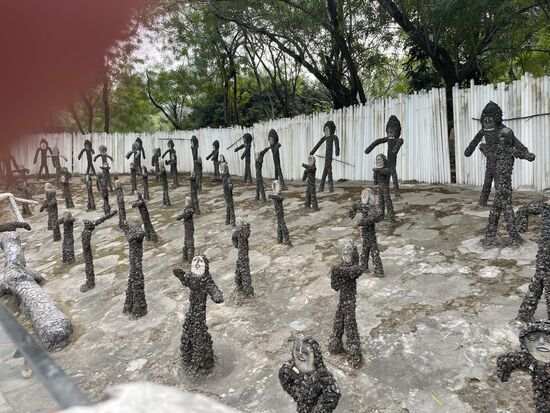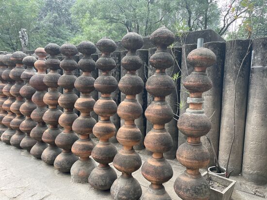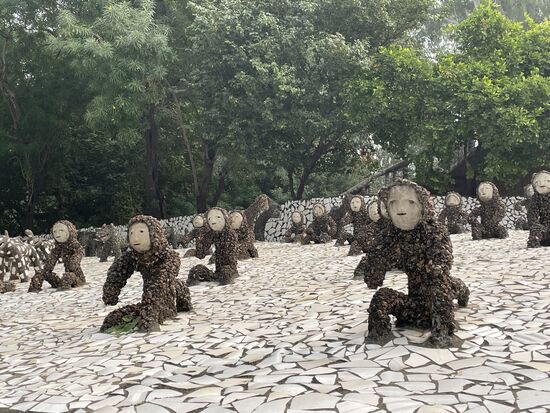 Und dann fängt es eigentlich überhaupt erst an. Tausende sind es, und sie lassen sich immer hinter neuen Mauern, hinter weiteren Toren entdecken. Es sind immer gleiche Figuren, die sich nur in kleinen Details unterscheiden. Sie haben fröhliche Gesichter aus Lehm oder sehen aus wie Marsmenschen hinter Glasscheiben. Es sind Tiere, Affen, Zebras, Katzen, Fantasietiere. Es sind Männer und Frauen, ganze Familien. Sie stehen in Reih und Glied oder in Gruppen. Sie stehen da, als ob sie gleich mit Yogaübungen beginnen würden oder sie sind am Meditieren.