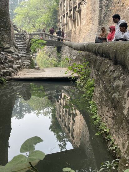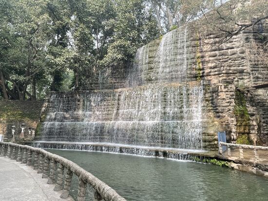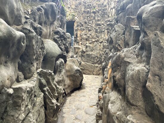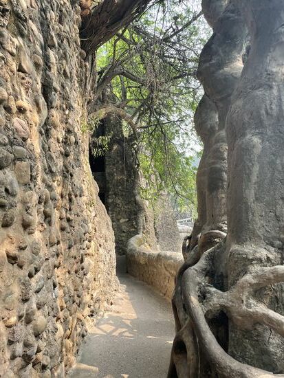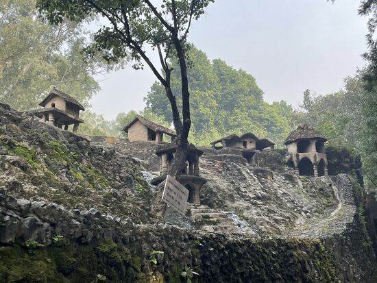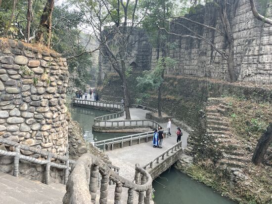 Es sind ganze künstliche Landschaften entstanden in diesem Garten, das heisst, die Schlucht wird wohl echt sein, aber der Wasserfall und die Wasserläufe sind zum Teil gemacht. Die Mauern sind vielleicht Reste von alten Gebäuden, vielleicht auch neu erstellte Gebilde. Die Wurzeln, die über einen der Pfade wachsen, sind aus Beton, und das kleine Miniaturdörfchen, das man nur sehen kann, wenn man sich streckt und über die hohe Mauer schaut, sind fantasievolle kleine Basteleien.