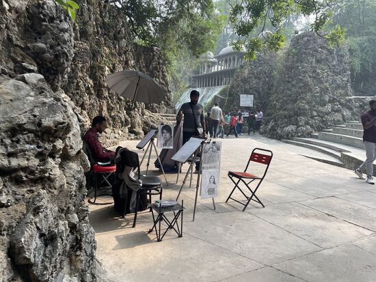 Ich schlendere durch durch die enge künstliche Schlucht zum Wasserfall, wo zwei Portrait-Zeichner auf Kunden warten, die sie karrikieren könnten. Einer hat über seinem Zeichenpapier einen kleinen Schirm aufgesteckt, so wie ihn Fotografen benutzen.